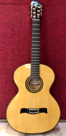 Автор Кошелев А.В  Гитара семиструнная мензура - 650 мм верхняя дека - ель корпус - клён гриф - красное дерево накладка - палисандр струны - нейлон отделка - глянцевая