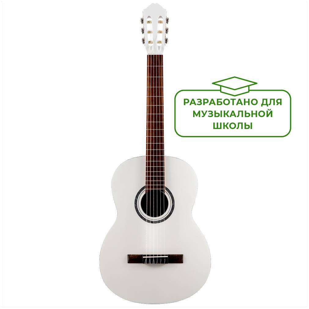 "Полноразмерная 4/4 классическая гитара белого цвета с матовой отделкой.
