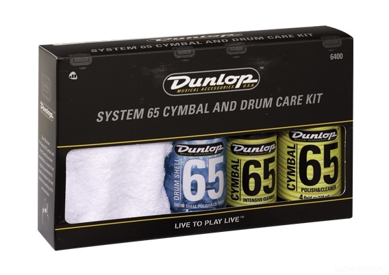 6400 System 65 Набор средств для ухода за барабанной установкой, Dunlop  Придайте своей барабанной установке внешний вид, будто она только что из магазина.  Набор включает в себя:  6444 Полироль и очиститель для обечаек барабанов.  6422 Средство для интен